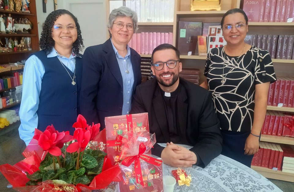 Padre Rodrigo com as irmãs paulinas Gizely, Agda e Viviane. Foto: Marco ASA